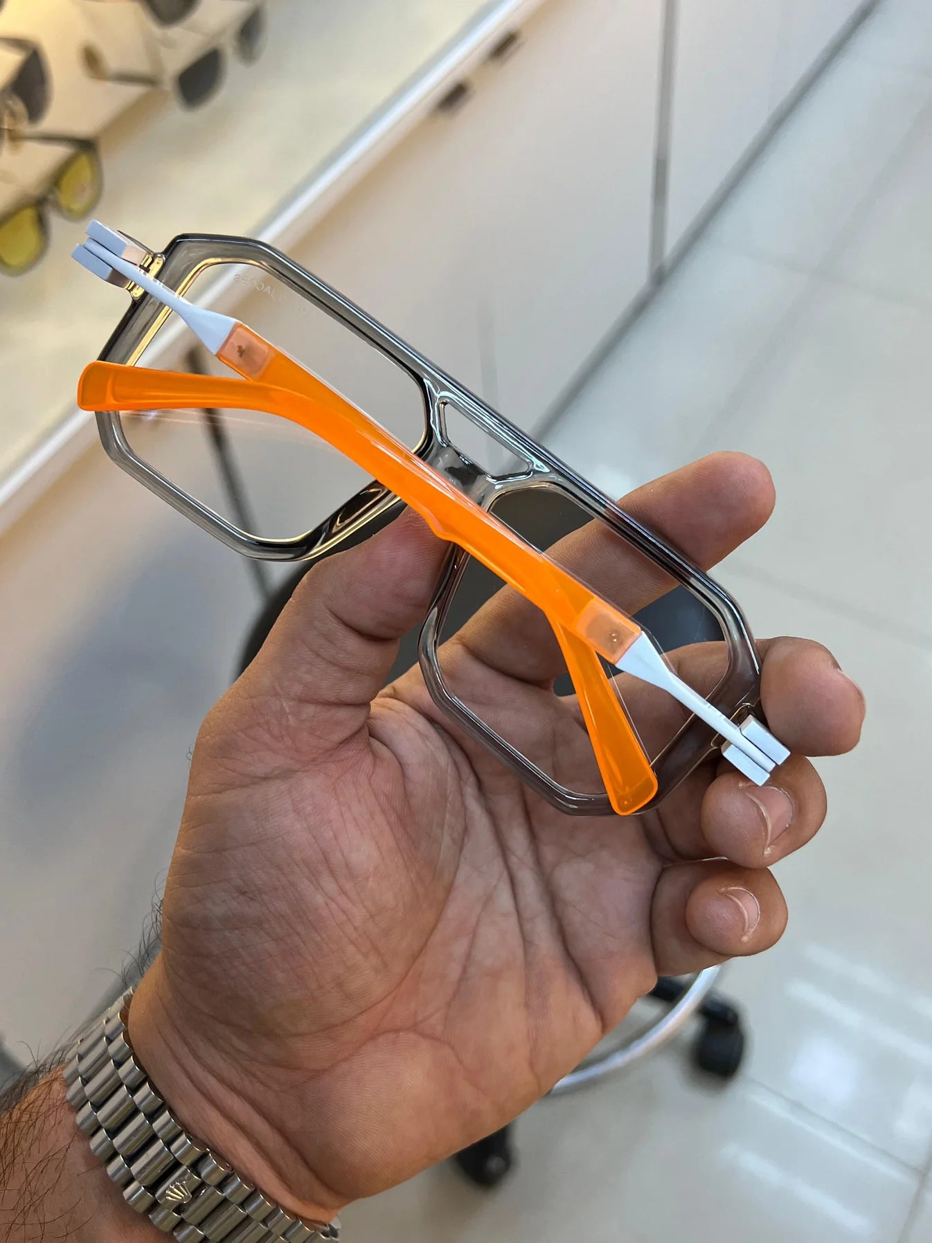 • Temple Color: Dual-tone – white hinges with bright orange temple tips
